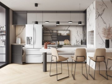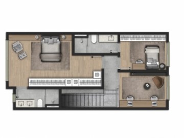 - Piso laminado na área íntima e porcelanato na área de convivência, unindo praticidade e sofisticação