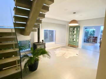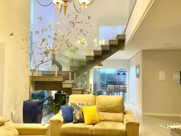 Distribuído em dois pavimentos, no térreo, hall de entrada, estar/jantar com lareira, mezanino, cozinha integrada com churrasqueira, lavanderia, banheiro e duas vagas de garagem .