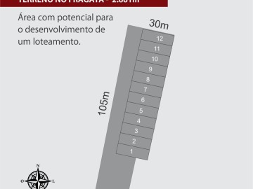 O terreno apresenta um potencial para o desenvolvimento de um loteamento, com espaço para criar até 12 terrenos individuais, cada um medindo aproximadamente 7 x 20 metros, além de uma área destinada a espaços comuns ou condominiais.