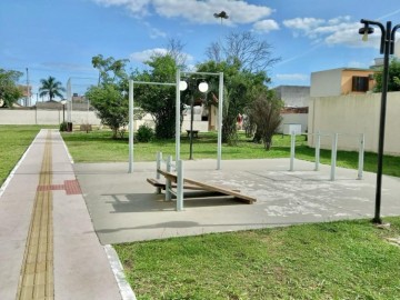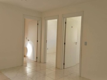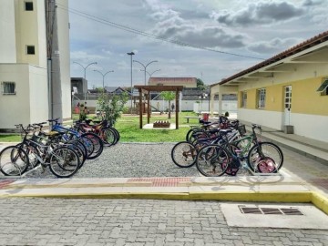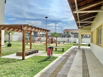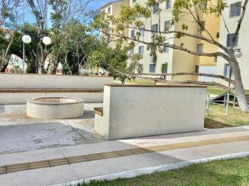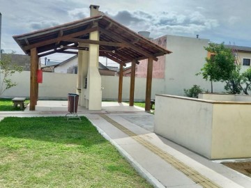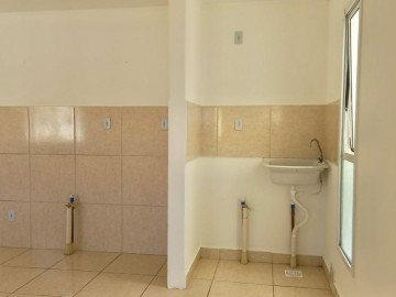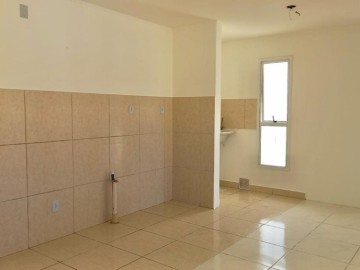 A unidade possui sala de estar, cozinha americana, área de serviço, banheiro, dois dormitórios e vaga de garagem.