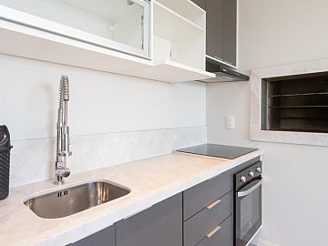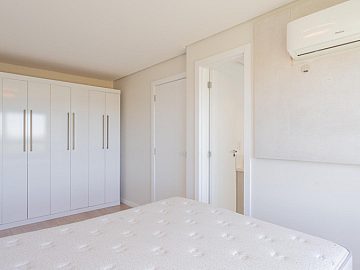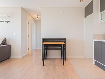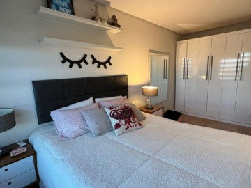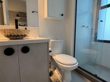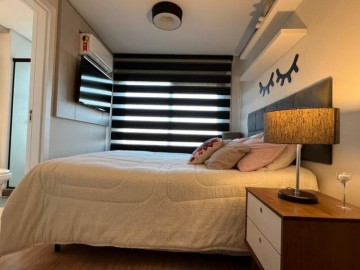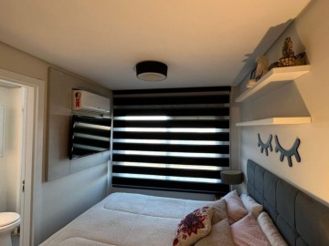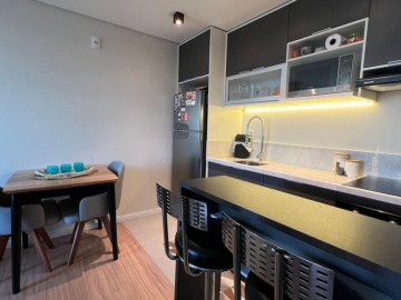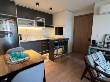 Dois dormitórios sendo 1 suíte mobiliada com ar condicionado, sala de estar com móveis planejados, sofá, ar condicionado, cozinha com churrasqueira, móveis planejados e fogão, banheiro completo, sacada.