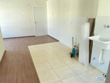 Imóvel novo distribuído em sala conjugada com cozinha, com possibilidade de instalação de churrasqueira ou lareira, 2 quartos, 1 banheiro e 2 garagens.