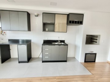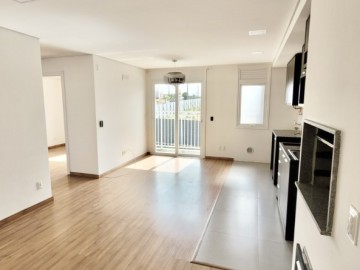 Distribuído em sala de estar e jantar com sacada, cozinha com churrasqueira, dois quartos sendo um suíte, banheiro social e uma vaga de garagem.