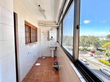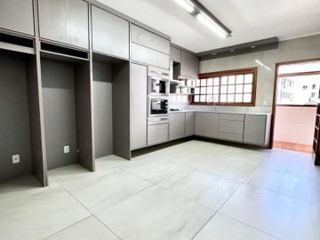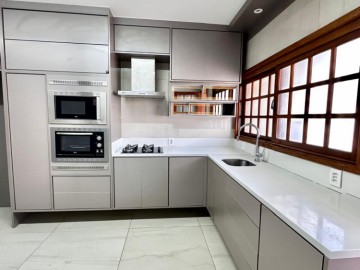 Cozinha ampla com móveis planejados, área de serviço e dependência com banheiro.