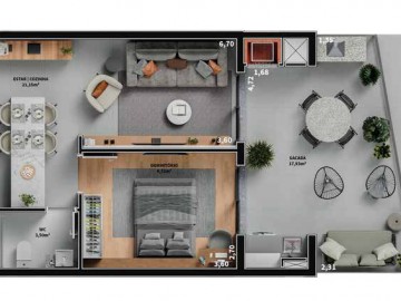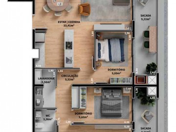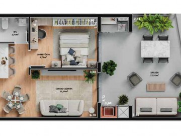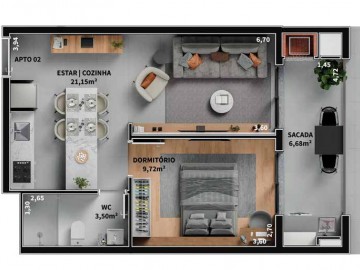 Apartamento de 02 dormitórios, sendo 01 suíte, sala integrada com a cozinha, um banheiro e sacada com churrasqueira. Opções com garden e com 01 dormitório.