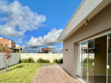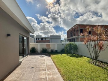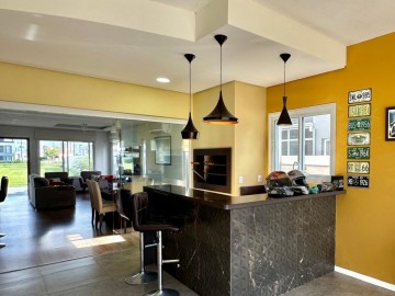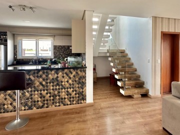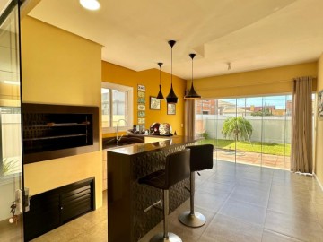 No pavimento térreo, o imóvel possui sala de estar e jantar integrados, cozinha americana, banheiro, espaço goumet com churrasqueira, pátio e vaga para dois carros.