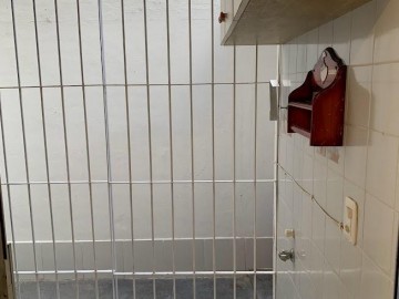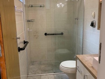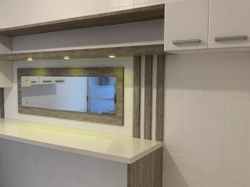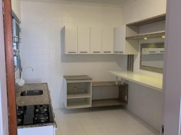 Possui cozinha com móveis planejados, área de serviço com banheiro e banheiro principal com balcão e box de vidro.