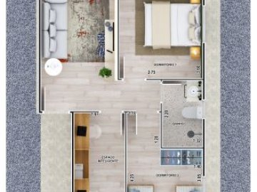 Possui sala de estar, cozinha integrada, 2 dormitórios, banheiro e pátio. Uma vaga de garagem.