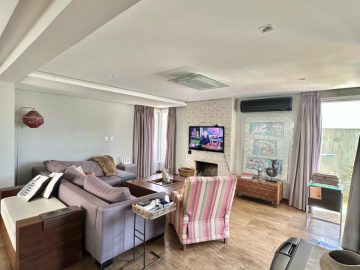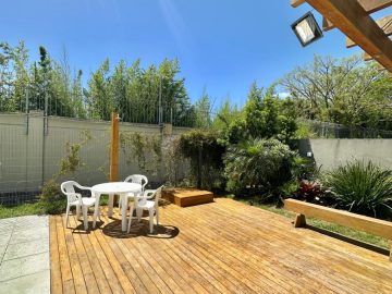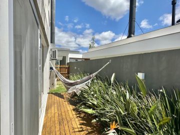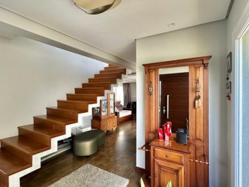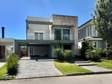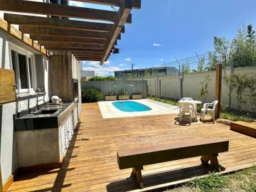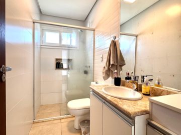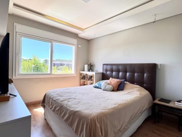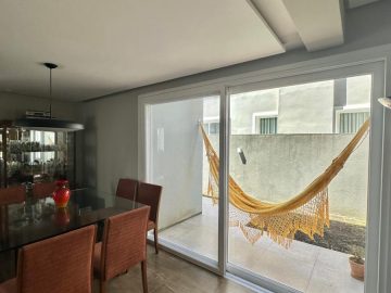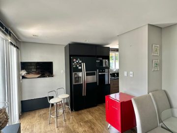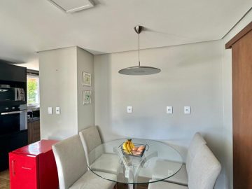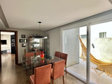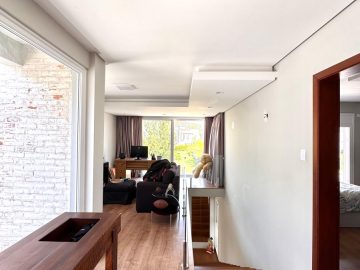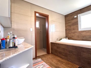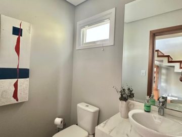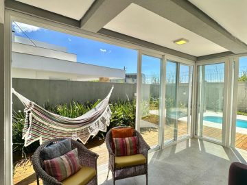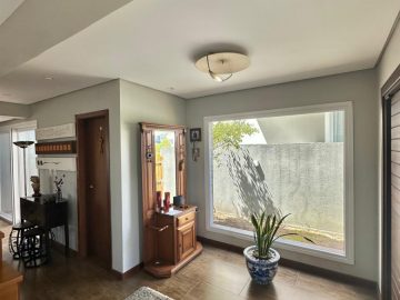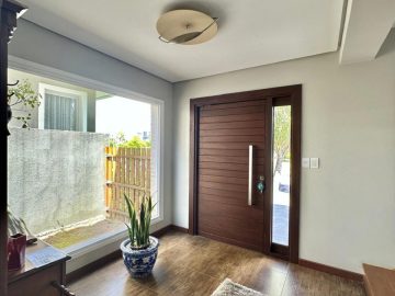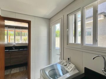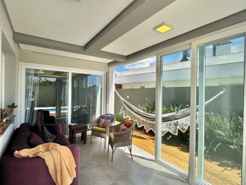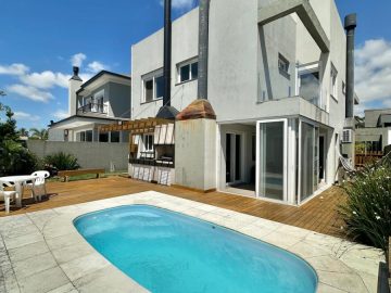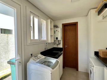 Distribuída em hall de entrada, lavabo, sala de estar com lareira, sala de jantar, cozinha com churrasqueira, varanda fechada anexada ao pátio, lavanderia, banheiro de serviço e pátio com piscina aquecida, deck e parrilla externa.
