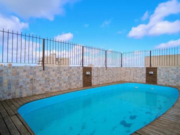Uma vaga de garagem, portaria 24h, dois elevadores, salão de festas e piscina.