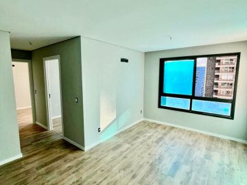 Apartamento 02 dormitórios, living estendido, sala, cozinha com churrasqueira, com 56 m², no décimo andar e garagem.