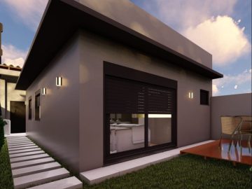 Distribuído em sala de estar e jantar com lareira e a cozinha integrada, banheiro social, 3 dormitórios, sendo um suíte com closet, lavanderia e pátio na parte superior. No térreo fica a garagem coberta para dois carros, espaço gourmet com churrasqueira, lavabo e deposito.