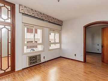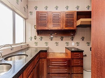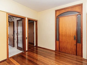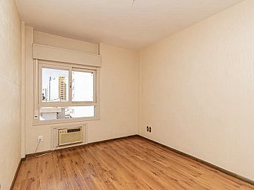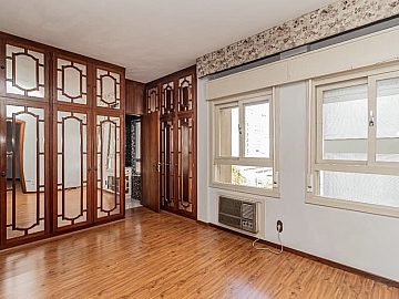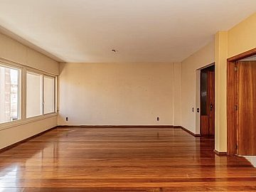 Distribuído em ampla living com sala de estar e jantar, três quartos, sendo um deles suíte, banheiro social, piso em madeira, móveis planejados na cozinha, dependência completa, saída social e de serviço, sacada fechada envidraçada.