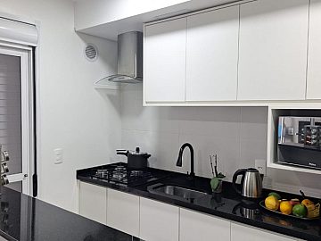 Ficam móveis planejados, torneira gourmet e exaustor na cozinha, dois ares condicionados Midea 12 mil Btus, telas de inseto e aquecedor de água.
