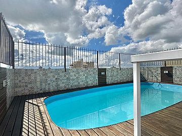 O edifício conta com salão de festas, espaço de churrasqueira, terraço e piscina, além de portaria 24 horas.