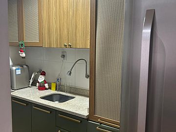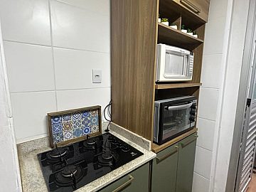 Ficam no apartamento os móveis da cozinha, do quarto de casal, o balcão do banheiro e o painel da sala da tv e espelho.