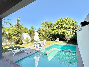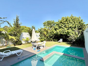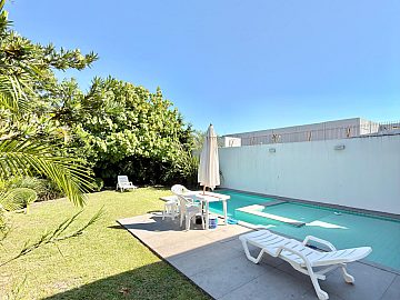 Amplo pátio com paisagismo, piscina e quiosque ao lado da área da piscina, perfeito para receber amigos e familiares.