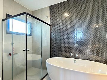Na área íntima, são três dormitórios, sendo uma suíte master com closet e banheira, oferecendo conforto e privacidade.