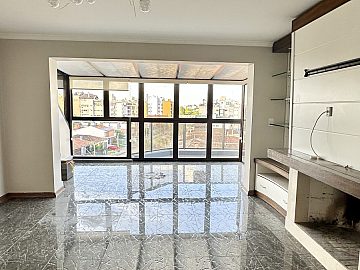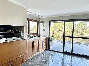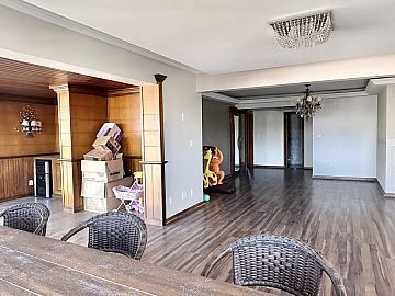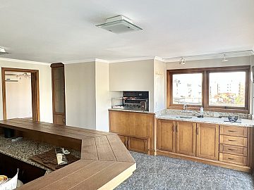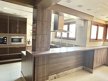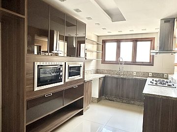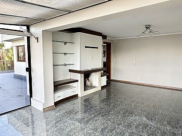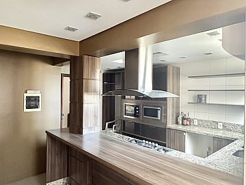 Sala com 03 ambientes, estar com lareira, jantar e mais uma sacada integrando a sala de estar com churrasqueira, lavabo, cozinha com planejados, área de serviço com banheiro.