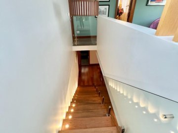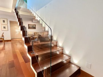 Escada em madeira, iluminação e guarda corpo em vidro;