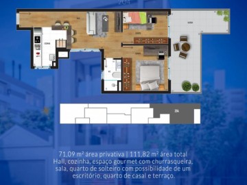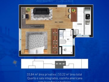 Apartamento 1 dormitório, sala integrada, cozinha e lavanderia.