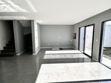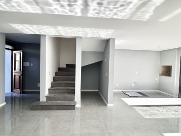Distribuída em hall, sala com lareira, lavabo, cozinha integrada, espaço gourmet com churrasqueira, pátio e duas vagas de garagem descobertas.