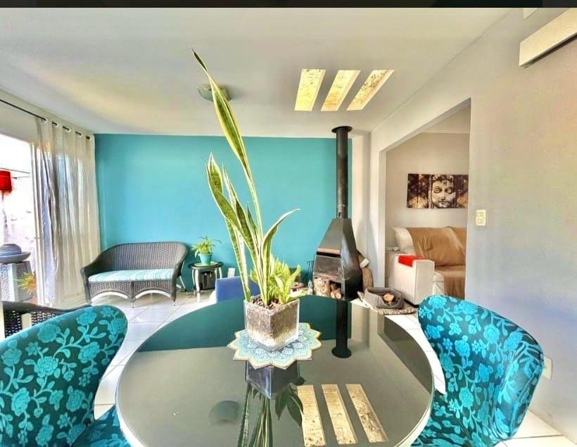 A casa possui sala com dois ambientes com lareira, cozinha, área de serviço, banheiro social, 3 dormitórios sendo uma suíte, pátio e 2 vagas.