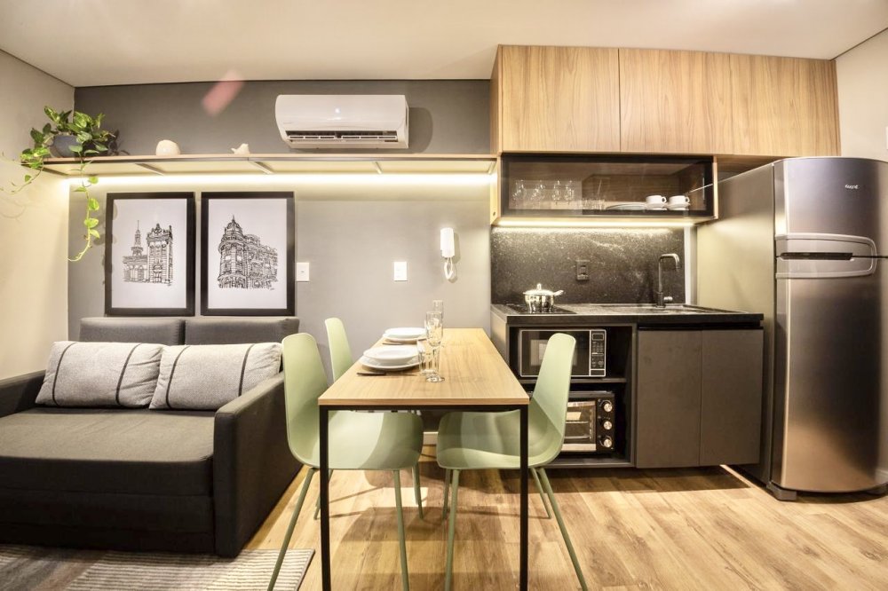 Apartamento Ultra Compacto, mobiliado, é uma ótima opção para jovens em seu primeiro imóvel, estudantes e viajantes.