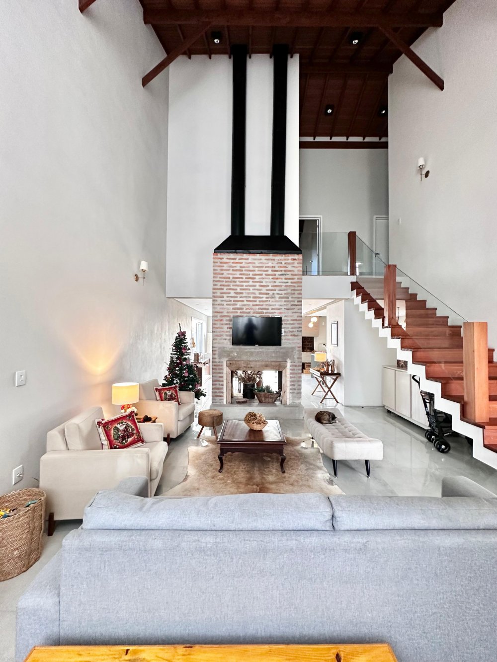 Na parte térrea com pé direito alto, encontra-se a salas integradas de estar e jantar com lareira, cozinha planejada com churrasqueira, lavanderia e dispensa.