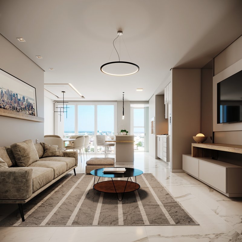 Apartamento distribuído por 03 dormitórios, sendo 01 suíte, 02 banheiros, 01 lavabo, sala, cozinha americana, churrasqueira e duas vaga de garagem, medindo 92.93m² de área privativa.