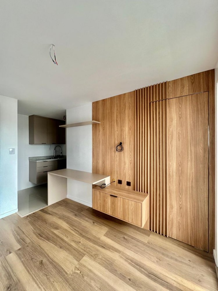 Distribuído em sala de estar com sacada e churrasqueira, cozinha mobiliada e equipada, quarto, banheiro e uma vaga de garagem.