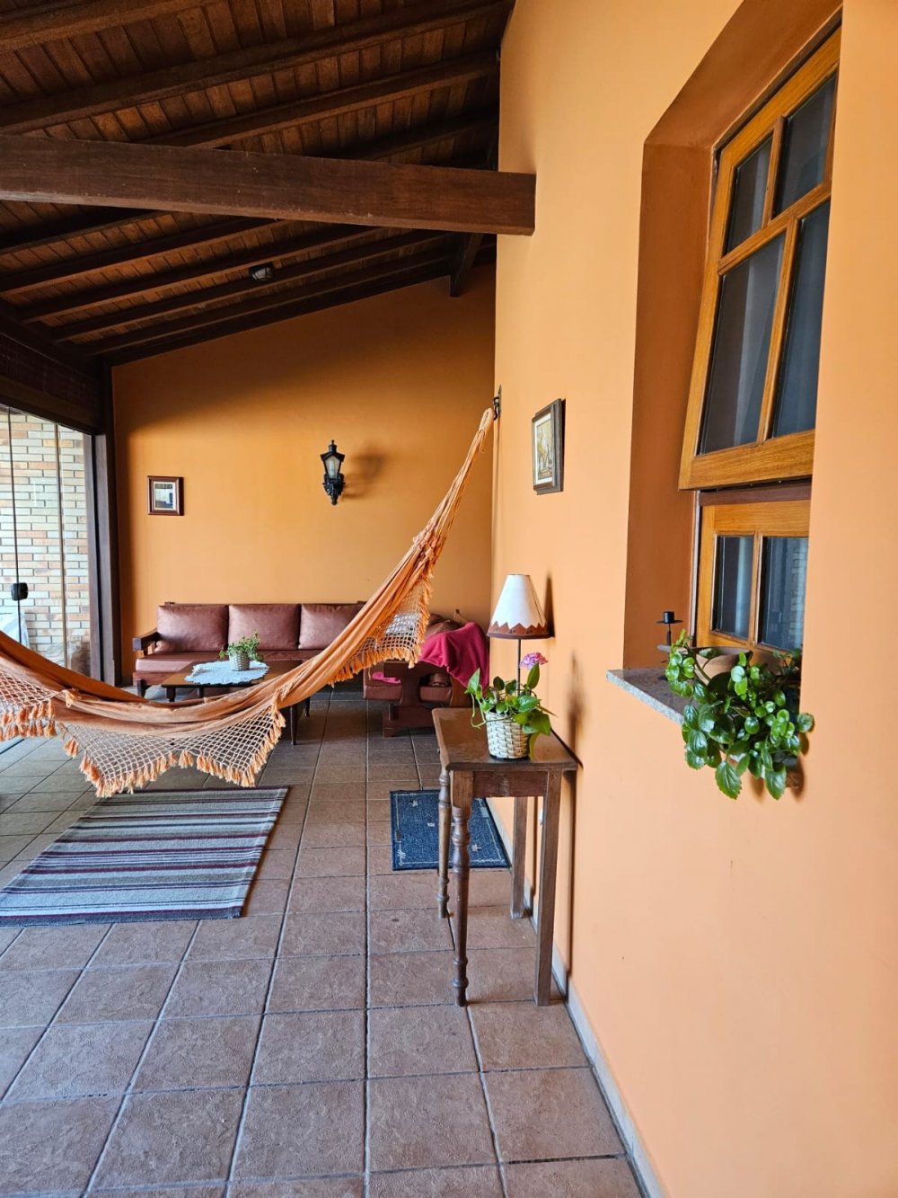 Amplo sobrado distribuído em sala de estar com lareira, cozinha americana mobiliada e sala de jantar, quarto no térreo e um banheiro.