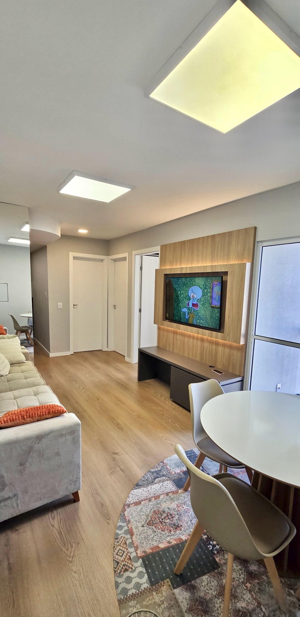 Imóvel totalmente mobiliado, móveis planejados da Bella Art, cozinha completa com forno, microondas, geladeira, depurador e torneira gourmet, piso flutuante resistente a água, sofá, painel com TV de 50polegadas, mesa de jantar com quatro cadeiras, três split de 12000bthus cada.