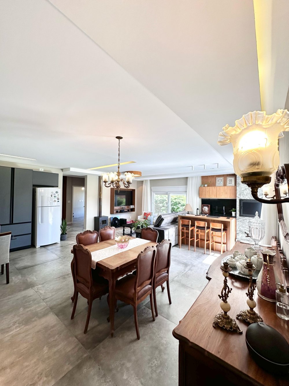 Distribuída em amplo living integra a sala e jantar, 4 ambientes, 3 dormitórios, sendo 1 suíte com closet, 1 escritório, banheiro social e dois lavabos (um interno e outro externo), lavanderia completa, depósito e uma cozinha estilo colonial. Para momentos de lazer, há uma churrasqueira e pátio.