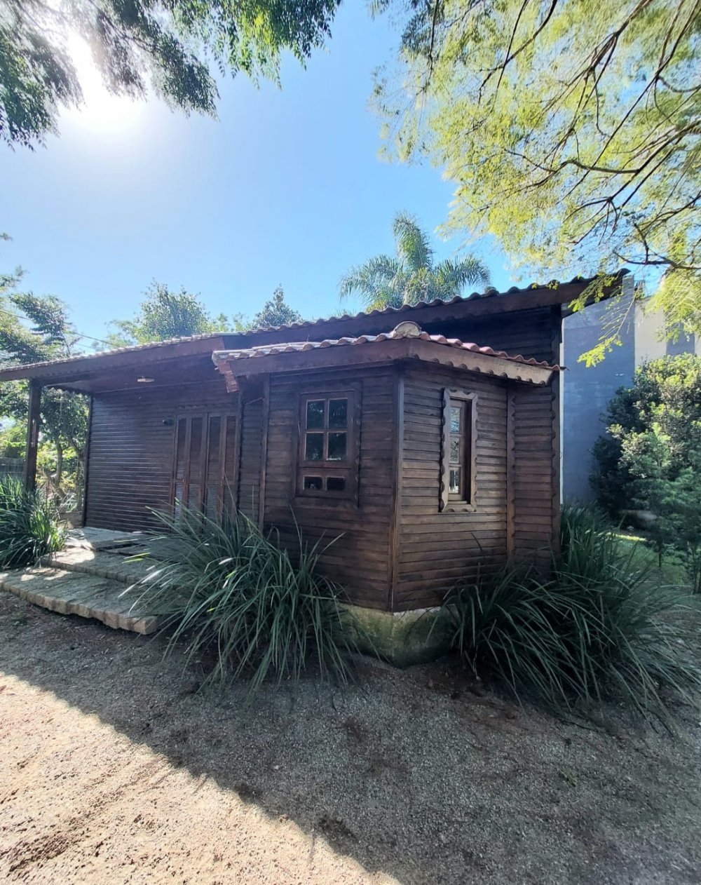 Cabana mista em terreno arborizado, distribuída em sala de estar com cozinha integrada, sala de jantar, banheiro social, 3 dormitórios, sendo 1 suíte com closet e espaço para home office.