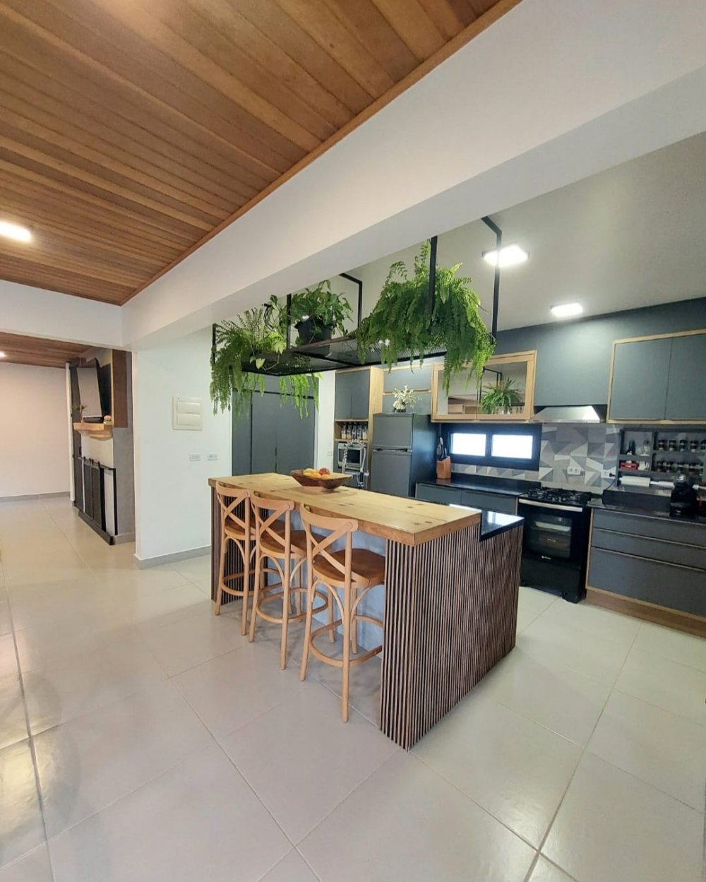 No térreo sala dois ambientes com lareira, integrada à cozinha planejada, churrasqueira, despensa, lavanderia, lavabo, escritório/oficina e varanda com deck.