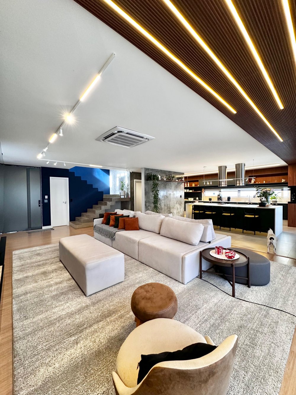 Primeiro pavimento com sala de estar e jantar integradas, com decoração elegante e móveis de alto padrão.
