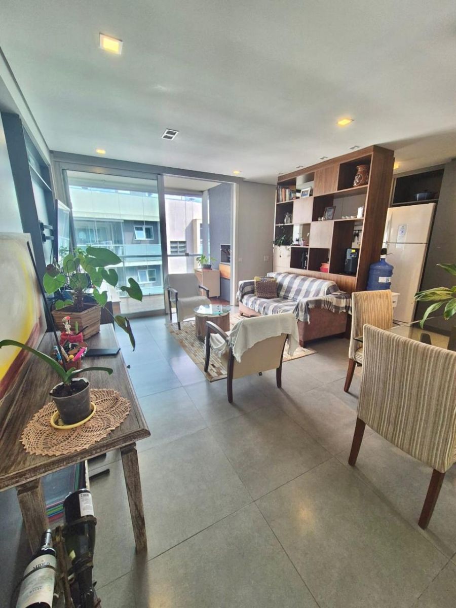 Distribuída em sala de estar e jantar, sacada com churrasqueira, cozinha amaricana, área de serviço, 2 dormitórios, sendo 1 suíte, 1 banheiro.