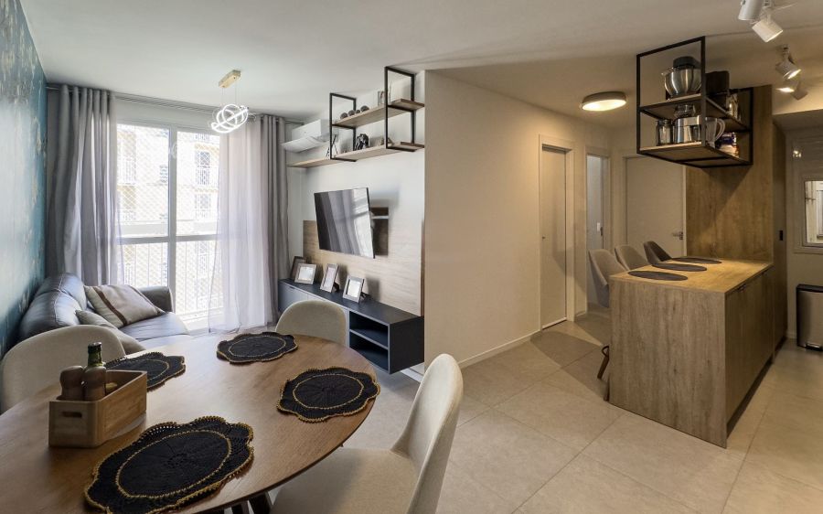 Apartamento todo mobiliado, distribuído em 02 dormitórios, 01 banheiro, sala de estar e jantar, cozinha americana, sacada e garagem coberta, medindo 50.25m² de área privativa.