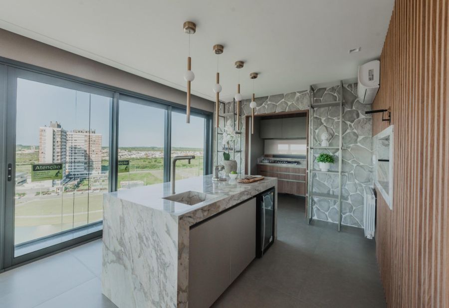 A cozinha apresenta bancada ampla, excelente ventilação e integração ao espaço gourmet equipado com parrilla uruguaia. Também conta com lavabo exclusivo para o gourmet, lavanderia com acesso ao elevador de serviço, espaço para geladeira side by side, laje técnica individualizada, aquecimento a gás e hidromassagem. O condomínio oferece piscina, deck molhado, fogo de chão com espelho d'água, salão de festas climatizado, espaço kids, storage e área gourmet.