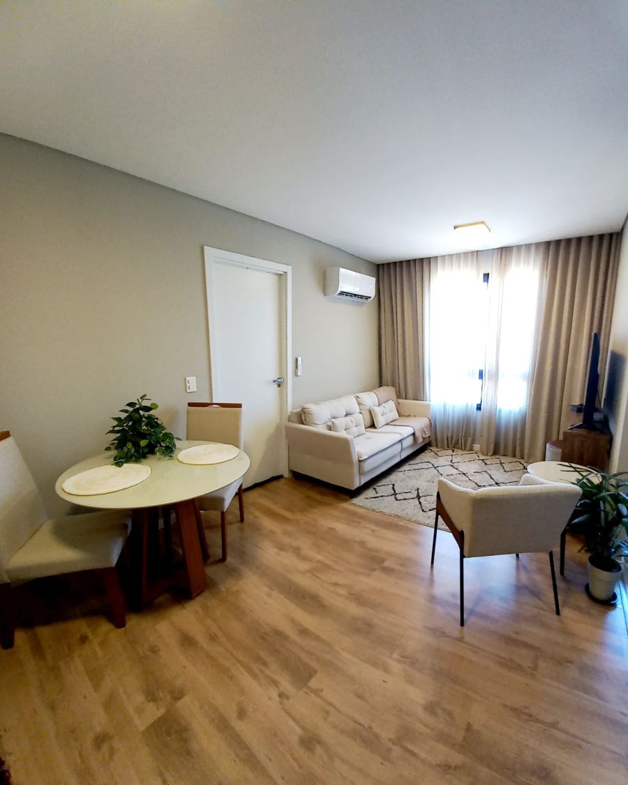 Imóvel composto por sala de estar e jantar integradas, cozinha planejada com churrasqueira, 1 dormitório e 1 banheiro.