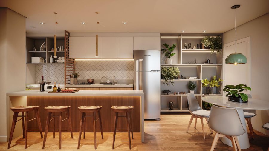 Distribuído em sala de estar com cozinha americana, sacada com churrasqueira, dois dormitórios e uma vaga de garagem.