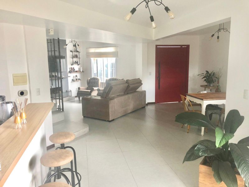 Distribuída por sala de estar com lareira, sala de jantar integrando a cozinha americana, garagem e pátio.