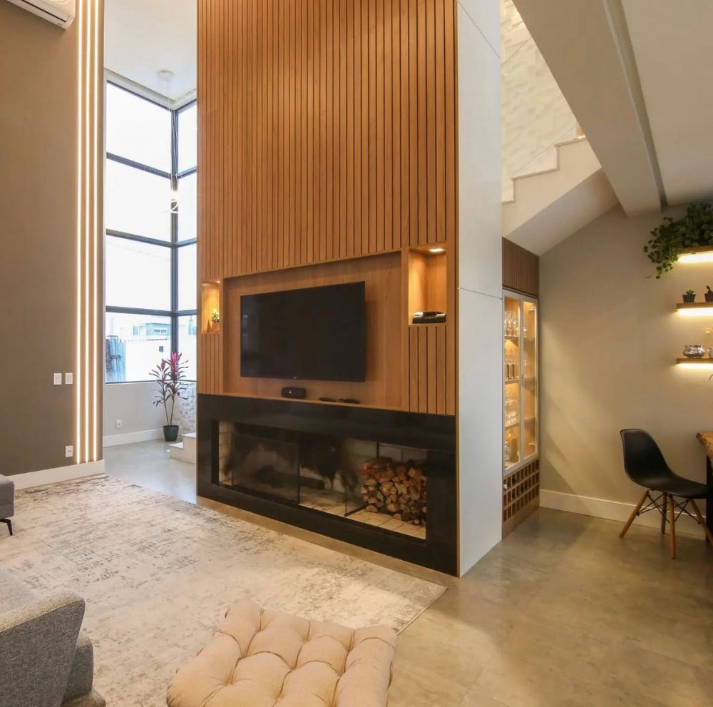 Distribuída em sala de estar com churrasqueira e pé direito alto, sala de jantar com cozinha gourmet em conceito aberto, lavabo, garagem para dois carros e pátio.